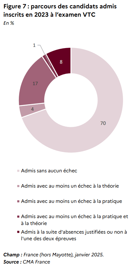 Au total, en janvier 2025, seuls 51 % des candidats VTC inscrits en 2023 avaient été admis à l’ensemble du parcours d’examen. Les autres se répartissent entre abandons, échecs répétés ou candidats encore en attente de repassage d’une épreuve. Ces chiffres confirment que la réussite à l’examen VTC ne se joue pas uniquement le jour J, mais dépend fortement de la préparation en amont et de la capacité du candidat à aller au bout du processus .